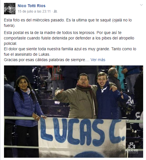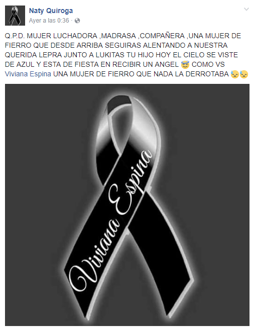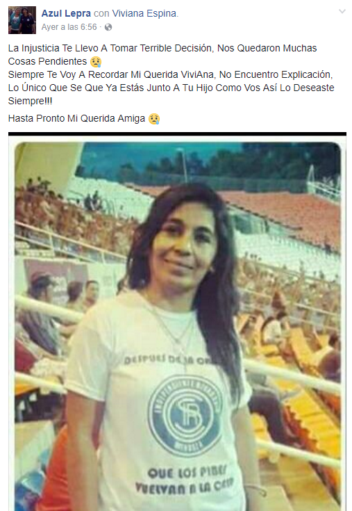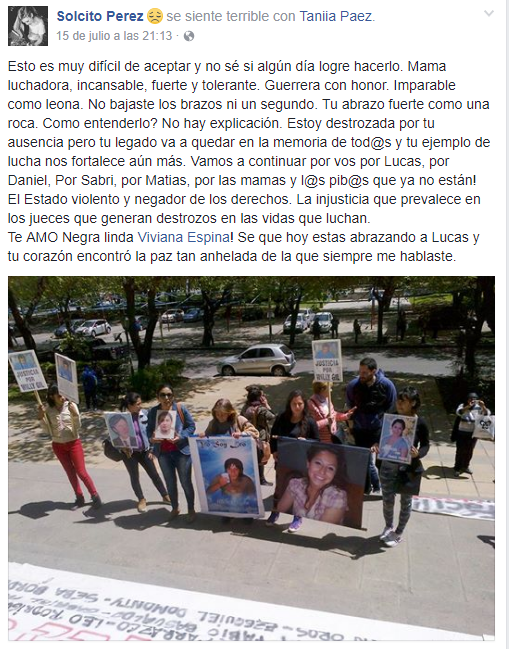 Es difícil rendirle homenaje a Viviana Espina, una madre que pasó por todo esto y que, además, tuvo que aprender a sobrellevar que se admitiera tácitamente la ruptura de esa conveniencia social que es la justicia. No hubo justicia por el asesinato de su hijo Lucas y por más que muchas personas a su alrededor intentaron acompañar su dolor e inclusive, tomar la bandera de la lucha por ella iniciada, ninguno pudo haber igualado jamás cabalmente su sensibilidad de madre a la que le quitaron a su hijo, violentamente.