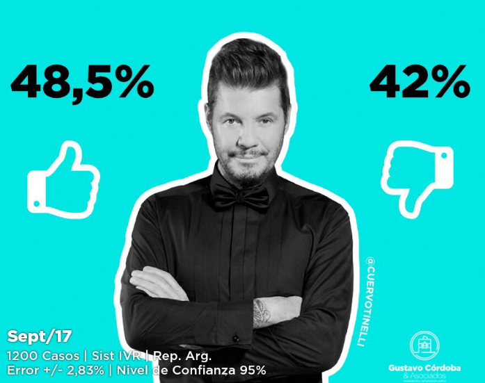 Una encuesta nacional realizada por Gustavo Córdoba & Asociados (por iniciativa propia, no patrocinada) empezó a traducir en números cuál es el alcance del fenómeno Tinelli: 99% sabe quién es, 48,5% tiene una imagen positiva de él y 42% una imagen negativa. Una particularidad es que mide mejor en las mujeres: 50,7% le sube el pulgar y el 37% se lo baja. En cambio en los hombres la visión negativa prima por sobre la positiva: 47% a 46,3%. La franja etaria más esquiva y a la que tendría que apuntarle para revertirla es la que va de los 45 a los 60 años. En los más jóvenes y en la tercera edad es donde tiene su público más fiel.