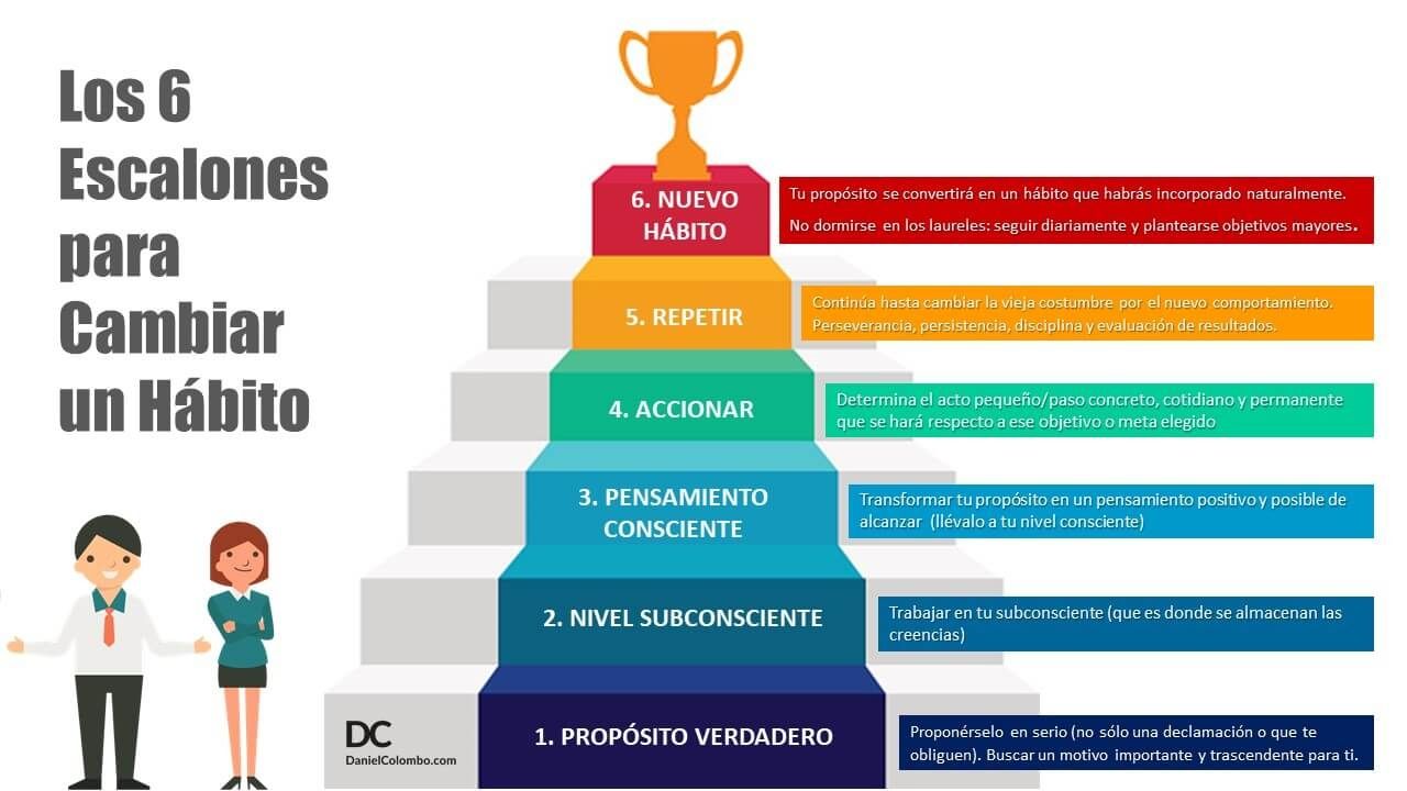 Esta debilidad al asumir un compromiso de cambio de hábitos se basa en la falsa creencia que con proponérselo alcanza. Y la realidad es que modificarlos lleva estos seis escalones: