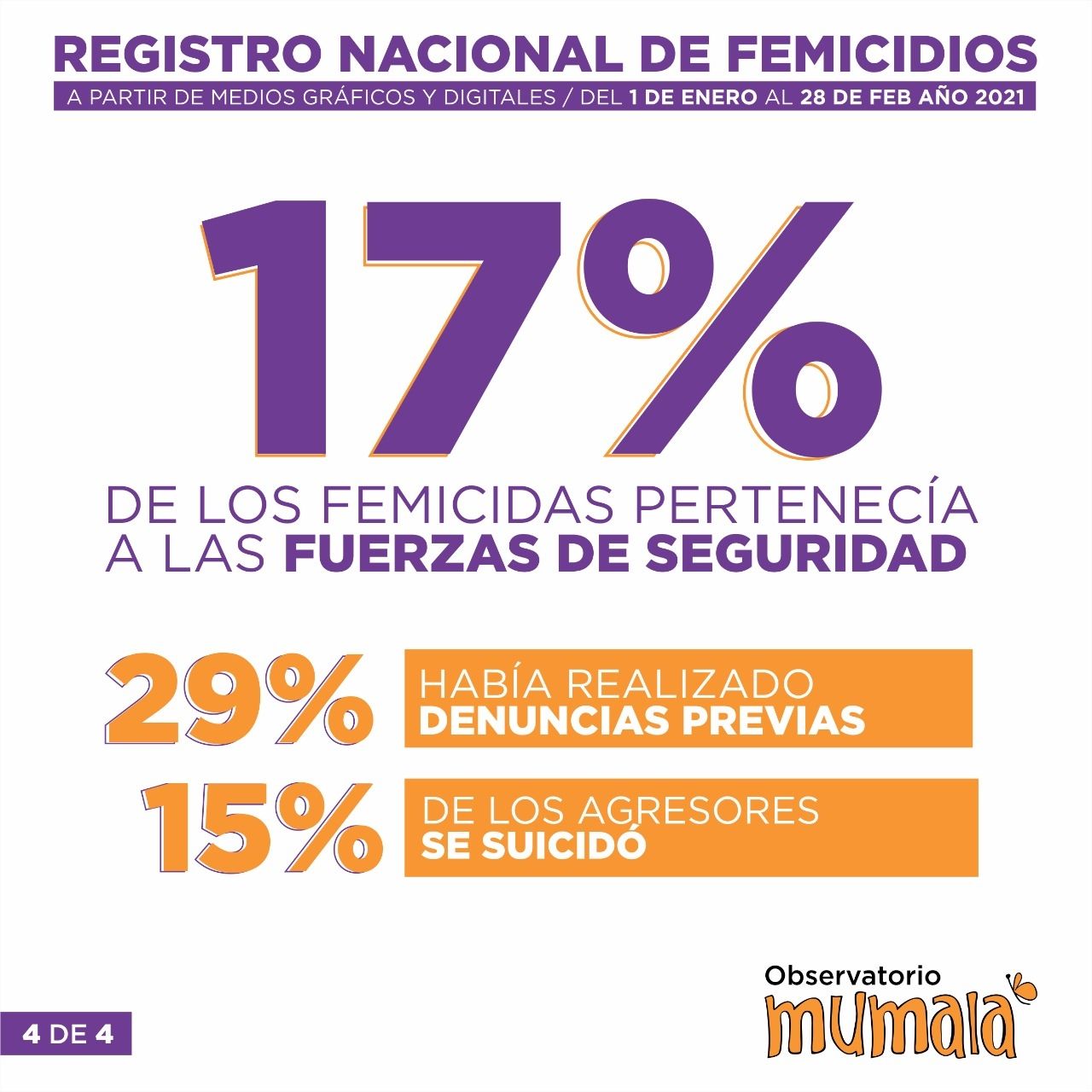 A esto se debe sumar que el 17 % fue perpetrado por integrantes de las fuerzas de seguridad, un aumento del 5% respecto a lo registrado en el mes de enero (12%). Otro dato relevante es el aumento del porcentaje de denuncias previas que habían realizado las víctimas. Se observa un 29% frente a un promedio del 20 % de meses anteriores.