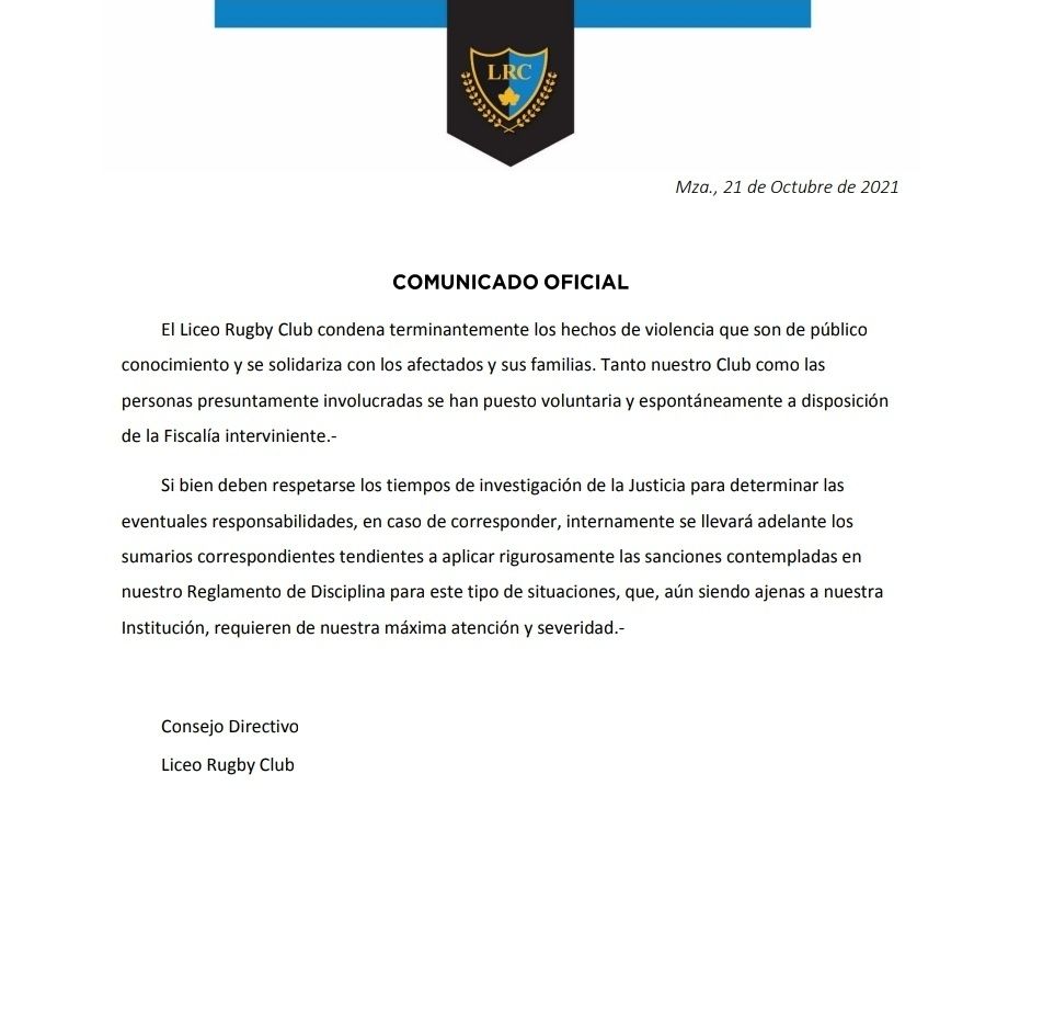 Ante esa situación, la entidad emitió este jueves un comunicado oficial donde expresa su postura sobre lo que pasó. "El Liceo Rugby Club condena terminantemente los hechos de violencia (...) y se solidariza con los afectados y sus familias. Tanto nuestro club como las personas presuntamente involucradas se han puesto voluntaria y espontáneamente a disposición de la fiscalía interviniente", comienza el texto.