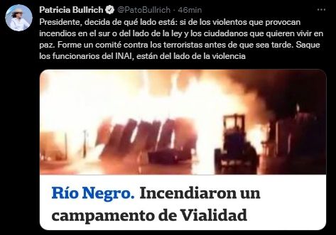 La presidenta del PRO, Patricia Bullrich, se refirió a lo ocurrido y criticó al presidente Alberto Fernández. "Presidente, decida de qué lado está: si de los violentos que provocan incendios en el sur o del lado de la ley y los ciudadanos que quieren vivir en paz", escribió Bullrich en su cuenta de Twitter.