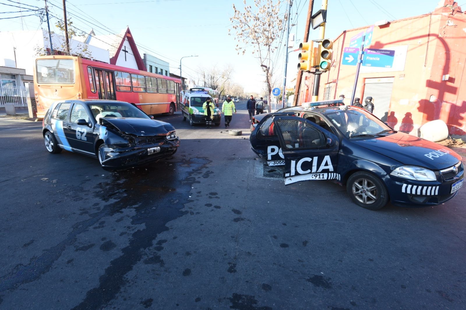 El móvil policial terminó subido a la vereda contra el semáforo de Francia y Paso de los Andes. El conductor del Golf culpó a los policías por el accidente, ya que asegura que cruzaron en rojo y sin las sirenas encendidas al momento del impacto.