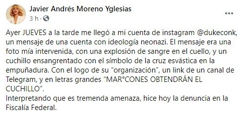 Ahora, Moreno detalló que el jueves por la tarde "me llegó a mi cuenta de instagram @dukeconk, un mensaje de una cuenta con ideología neonazi. El mensaje era una foto mía intervenida, con una explosión de sangre en el cuello, y un cuchillo ensangrentado con el símbolo de la cruz esvástica en la empuñadura. Con el logo de su “organización”, un link de un canal de Telegram, y en letras grandes “MAR°CONES OBTENDRÁN EL CUCHILLO”.