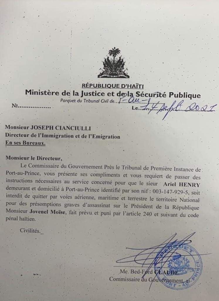 El magistrado sostiene que el primer ministro Ariel Henry se comunicó dos veces con uno de los sujetos que habrían organizado el ataque, Joseph Felix Badio, con quien habría conversado algunas horas después del hecho de sangre. A partir de esos datos, la Justicia comenzará a investigar qué rol tuvo Henry en el magnicidio. Se espera que el juez de instrucción Garry Orélien concrete la imputación en breve.