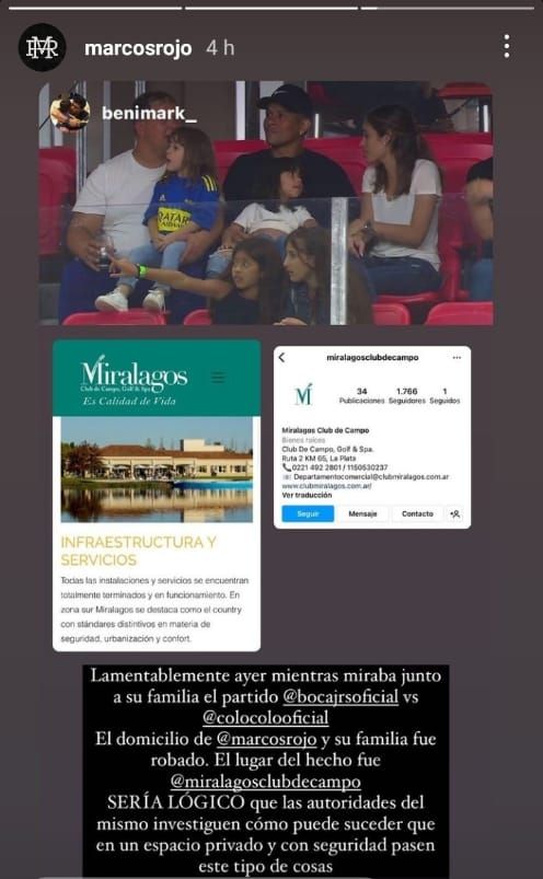 "Lamentablemente, ayer mientras miraba junto a su familia el partido Boca vs. Colo Colo, el domicilio de Marcos Rojo y su familia fue robado. El lugar del hecho fue Miralagos Club de Campo. Sería lógico que las autoridades del mismo investiguen cómo puede suceder que en un espacio privado y con seguridad pasen este tipo de cosas", dice el mensaje que luego compartió el jugador en su cuenta de Instagram.