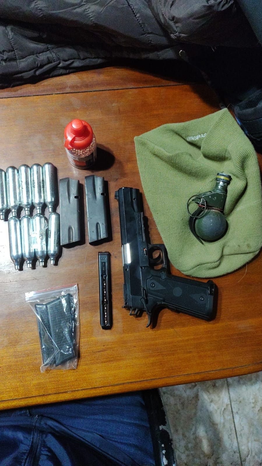 Personal de la UID junto con Narcocriminalidad y personal de Explosivos realizaron un allanamiento en dicho domicilio, logrando la detención de 7 personas y el secuestro de: una granada de guerra, dos cargadores metálicos y dos cachas de un arma de fuego tipo calibre 9 mm; una pistola con CO2, (replica de 9 milímetros) con varias garrafas de gas y proyectiles para dicha arma; un frasco con marihuana, 25 kilos de cobre aprox, treinta mil quinientos pesos en efectivo.