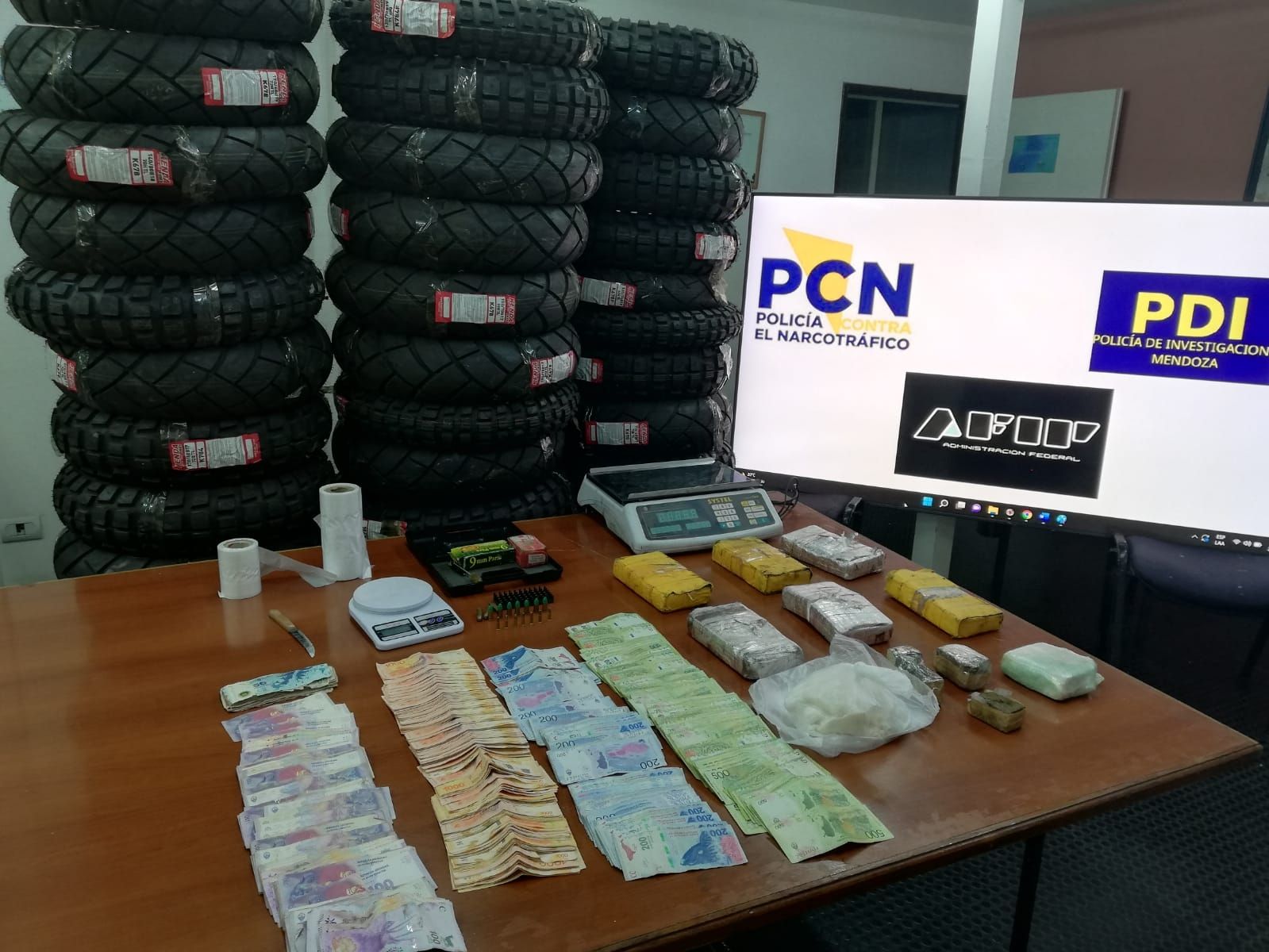El primer allanamiento se produjo en la calle Pedro del Castillo al 5800, en Guaymallén. En ese domicilio se incautaron los 7 ladrillos de cocaína junto a 400 gramos de marihuana, 17 cartuchos de distintos calibre y 39 cubiertas de moto de distinto rodado del tipo enduro y “pisteras”, 2 balanzas y elementos de fraccionamiento.