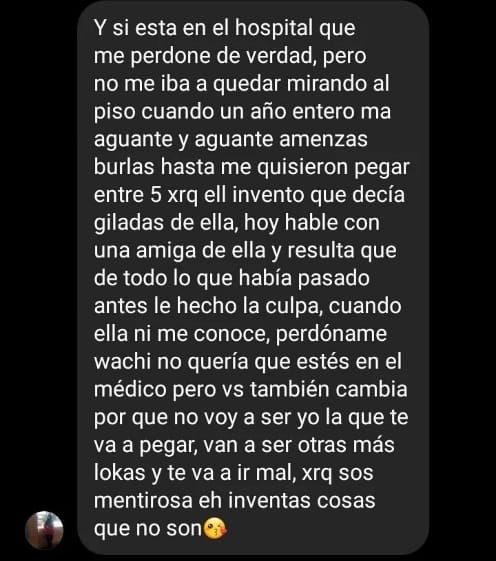Finalmente, en relación al estado de salud de la joven internada, expresó: "Si está en el hospital que me perdone, pero no me iba a quedar mirando al piso cuando un año entero me aguanté amenazas y burlas. Perdoname, no quería que estés en el médico pero vos también cambiá, porque no voy a ser yo la que te va a pegar, van a ser otras más y te va a ir mal porque sos mentirosa".