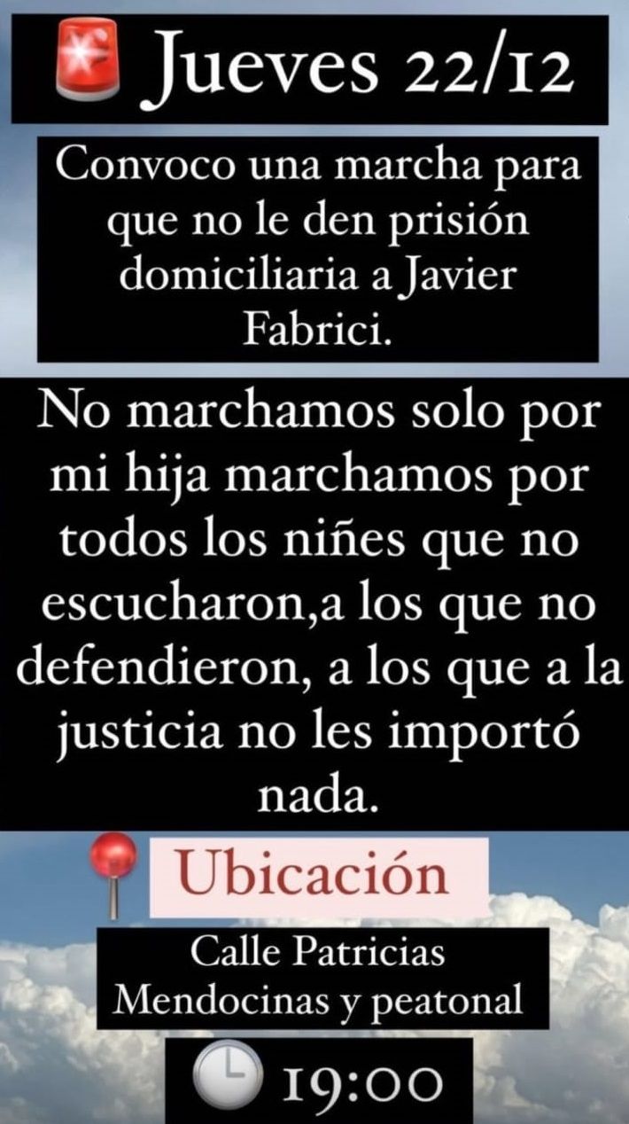 Este jueves por la tarde, familiares de la menor realizarán una marcha para pedir que se le niegue la prisión domiciliaria solicitada por la defensa del sujeto. La misma tendrá como punto de partida Peatonal y Patricias Mendocinas, a las 19 horas.