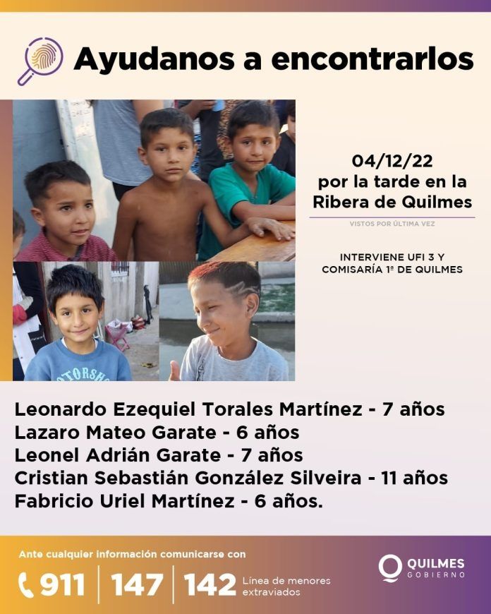 El hecho se conoció hace algunas horas en Quilmes, cuando familiares de los niños viralizaron la búsqueda de cinco menores a través de las redes sociales. Se trata de menores de 11, 7 y 6 años, quienes el domingo a las 20 horas, fueron levantados en la Ribera por una camioneta blanca.