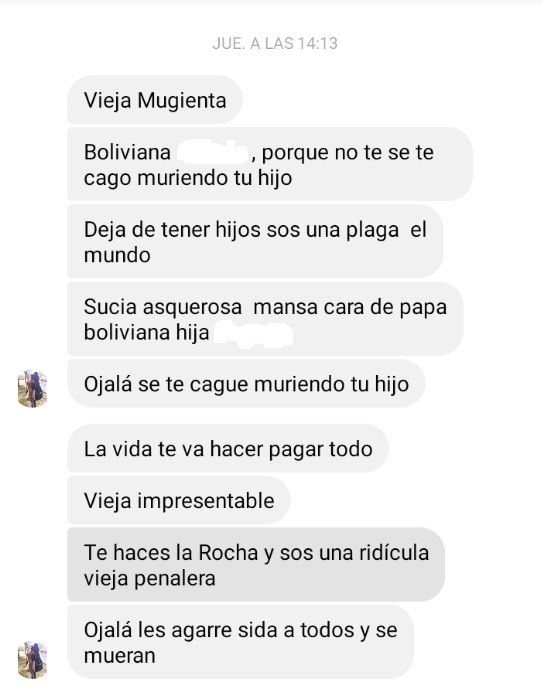 "No le importan las amenazas que le hacen los otros presos. Le preocupan las amenazan que me hacen a mi o a mis hijos más chicos por parte de la familia de Thiago. Todos los días recibo amenazas y mis hijos tienen miedo de ir a la escuela", dijo Estela mostrando casa uno de los repudiables mensajes que recibe.