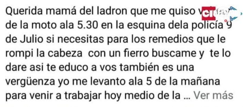 "Querida mamá del ladrón que me quiso voltear de la moto a las 5:30 en la esquina de la Policía del barrio 9 de Julio. Si necesitás para los remedios ya que le rompí la cabeza con un fierro buscame y te lo daré, así te educo a vos también. Es una vergüenza, yo me levanto a las 5 de la mañana para venir a trabajar hoy en medio de la tormenta, con el agua hasta la cintura. Mamá mandalo a trabajar no a robar, así como voy a trabajar yo"