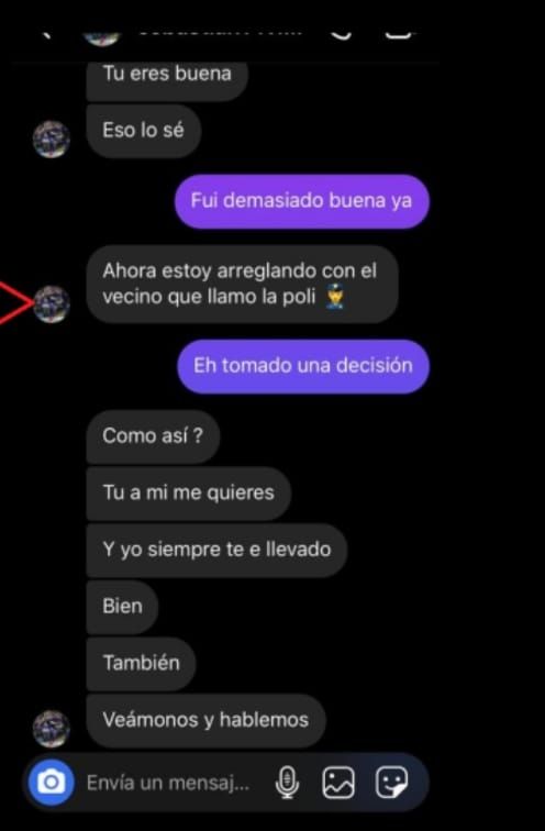 "Yo se que tu me quieres. No vallas a hacer nada", se lee en el chat. Y continúa: "Sabes que no puedo dar de qué hablar. Hágalo por mi familia. Yo soy el pan de cada día".