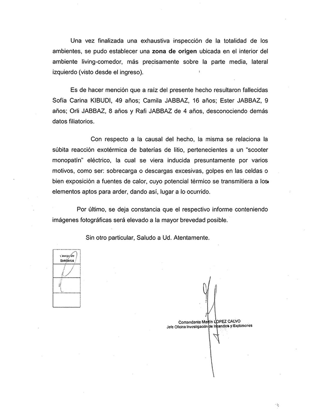 El fiscal porteño Sebastián Fedullo que investiga el trágico incendio que terminó con la vida a Sofía Kibudi y sus cuatro hijos en el departamento de calle Ecuador al 1000 en Recoleta, recibió de parte de Bomberos de Policía de la Ciudad el informe preliminar. En el mismo, confirman que las baterías de litio de un monopatín hallado en el ingreso del living comedor del departamento fueron las responsables del hecho.