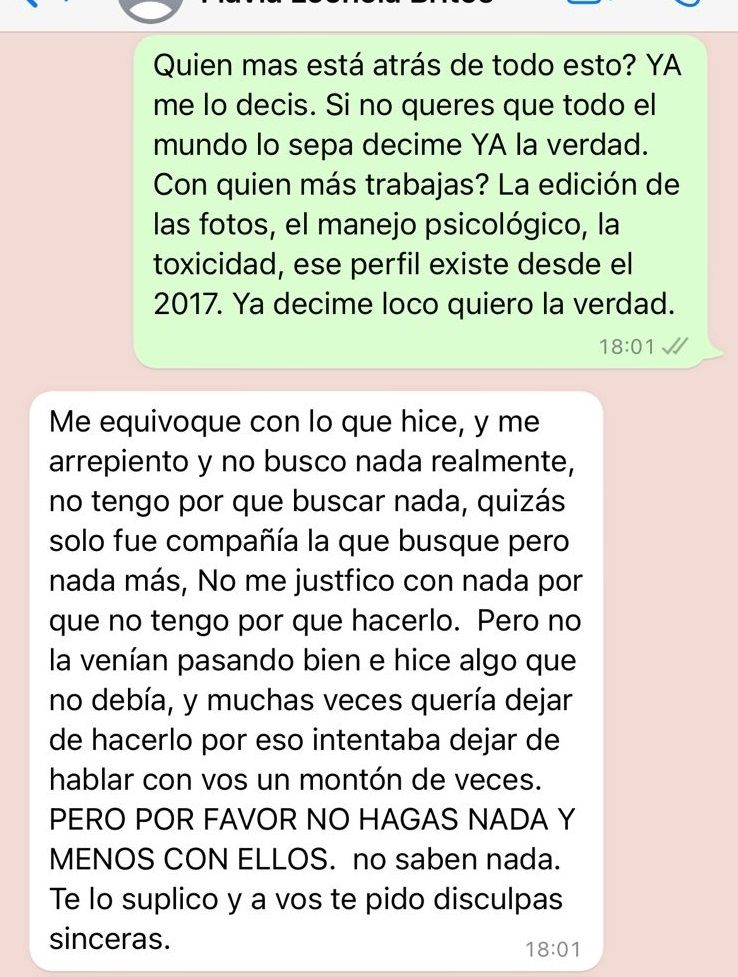 Con gran incertidumbre, miedo y enojo por la situación, M. decidió confrontarlo. "¡Decime ya quién cara** sos!", le gritó la joven mendocina a la persona. Luego de varias amenazas, recibió una respuesta: "Soy una mujer que se enamoró de vos, hice las cosas mal y te prometo que ahora borro toda la información que tengo de vos".