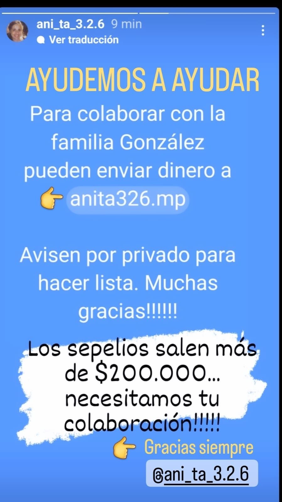 Quien desee colaborar, puede realizarlo a través de Mercado Pago a la cuenta de Ana Gatto, alias: anita326.mp.