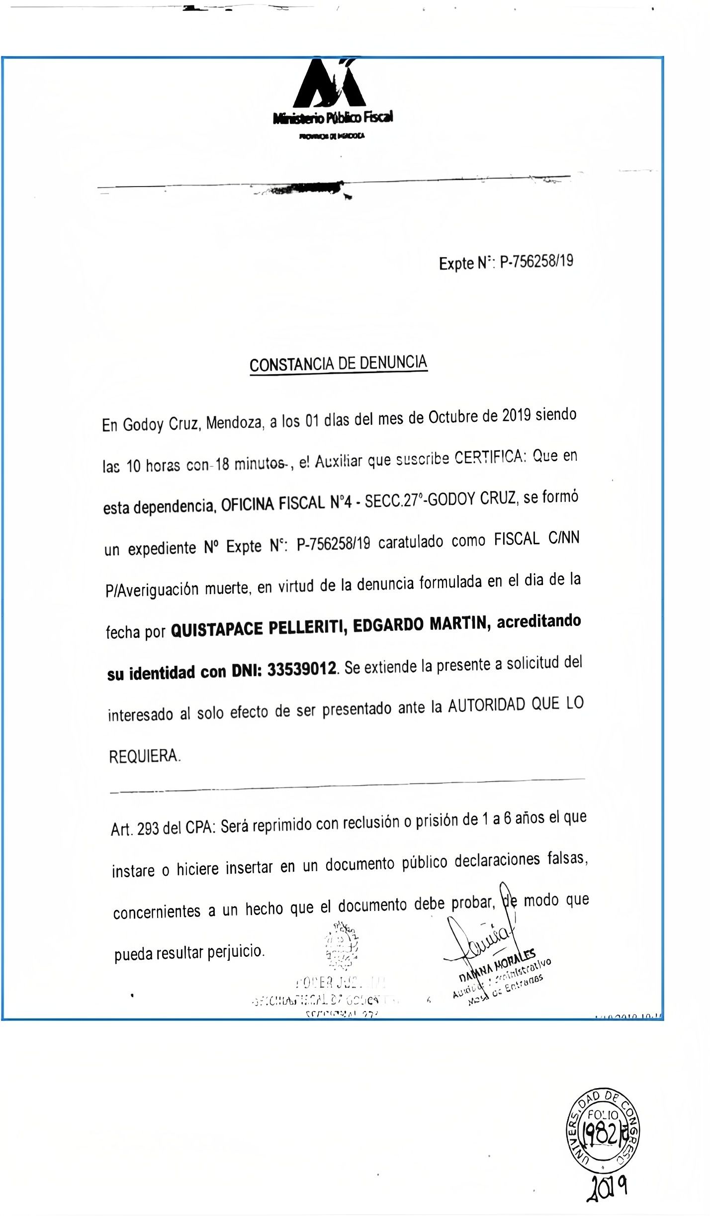 Tan solo un día después, la familia de la víctima presentó la denuncia por mala praxis ante la Oficina Fiscal 4. Se confeccionó el expediente P-756258/19, caratulado como "Fiscal C/NN P/Averiguación muerte". Según detallaron, el caso pasó por cuatro fiscales.