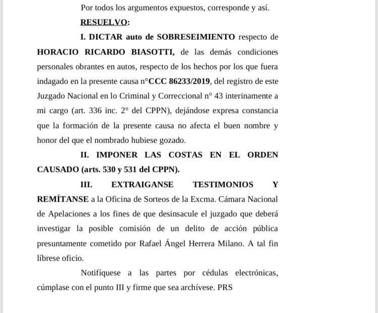 El magistrado interviniente sostuvo que obtenidas las nuevas piezas probatorias luego del decisorio del 1 de febrero de 2022 y tras un análisis exhaustivo e integral del plexo reunido en tal sentido, “ adoptaré un criterio desincriminante y dispondré el sobreseimiento de Horacio Ricardo Biasotti”