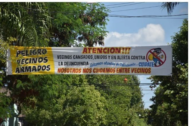 "Peligro, vecinos armados", comienza explicando un pasacalles colocado en el barrio Belgrano de esa provincia. "Atención!! Vecinos cansados, unidos y en alerta contra la delincuencia. Estamos atentos Sr. Delincuente... CUIDATE. Nosotros nos cuidamos entre vecinos", finaliza uno de los carteles que se hizo viral a través de Twitter.