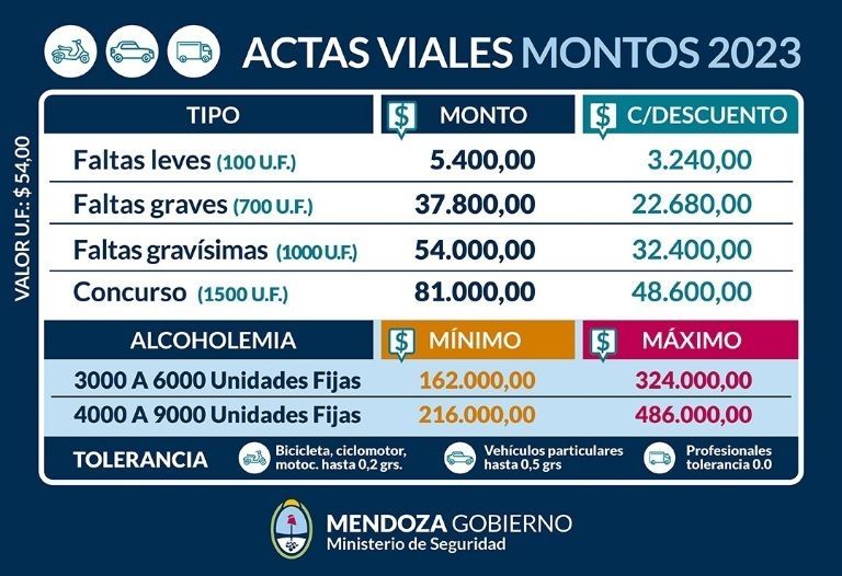 A partir del 1 de enero de 2023, en Mendoza rigen los nuevos montos de las multas viales para aquellos conductores infractores. La Unidad Fija (U.F.) pasó de 30 a 54 pesos.