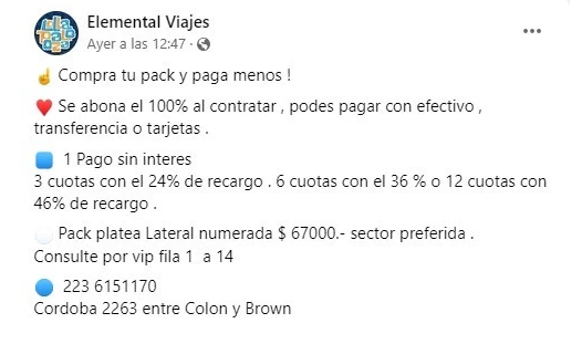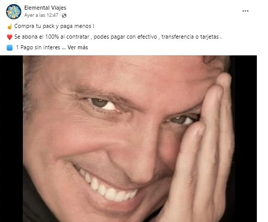 La promoción dice "¡Comprá tu pack y pagá menos! Se abona el 100% al contratar, podés pagar con efectivo, transferencia o tarjetas". "1 pago sin interés, 3 cuotas con el 24% de recargo, 6 cuotas con el 36% o 12 cuotas con 46% de recargo. Pack Platea lateral numerada $67.000, sector preferida. Consulte por vip fila 1 al 14", agrega el anuncio, sin precisar la fecha en que sería dicho show de Luis Miguel.