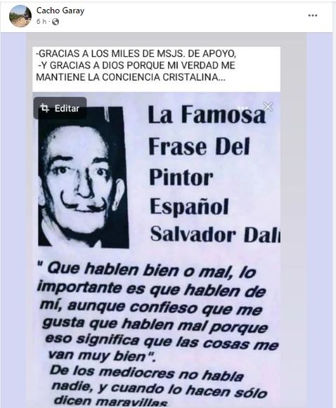 El humorista Cacho Garay fue denunciado por su esposa Verónica Macías y detenido este miércoles durante la tarde tras un allanamiento en un domicilio de Luján de Cuyo en el cual le encontraron diferentes armas, entre ellas algunas de fuego. En sus redes sociales publicó un descargo con una frase de Dalí.