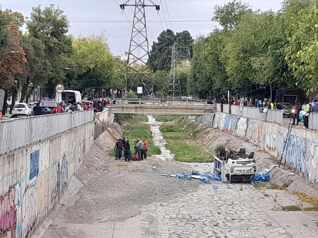 Un joven que en la tarde del jueves se encontraba trabajando en el reparto de agua mineral y sodas, protagonizó un aparatoso accidente al volcar el camión en el cual circulaba y caer a un zanjón. Ocurrió en la Ciudad de Mendoza.