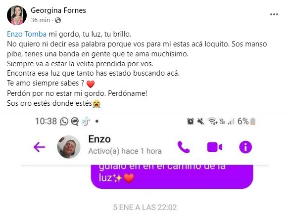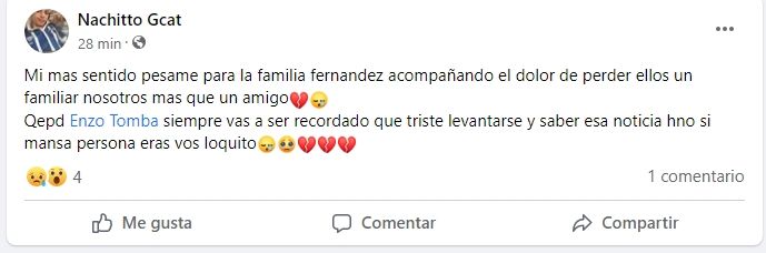 En primer lugar, amigos y gente cercana a la víctima escribieron sentidas palabras en las redes sociales. "Mi más sentido pésame para la familia Fernández, acompañando el dolor de perder ellos un familiar, nosotros más que un amigo. Qepd Enzo Tomba, siempre vas a ser recordado, que triste levantarse y saber esa noticia hno (SIC), si mansa persona eras vos loquito", dijo uno de sus amigos en Facebook.