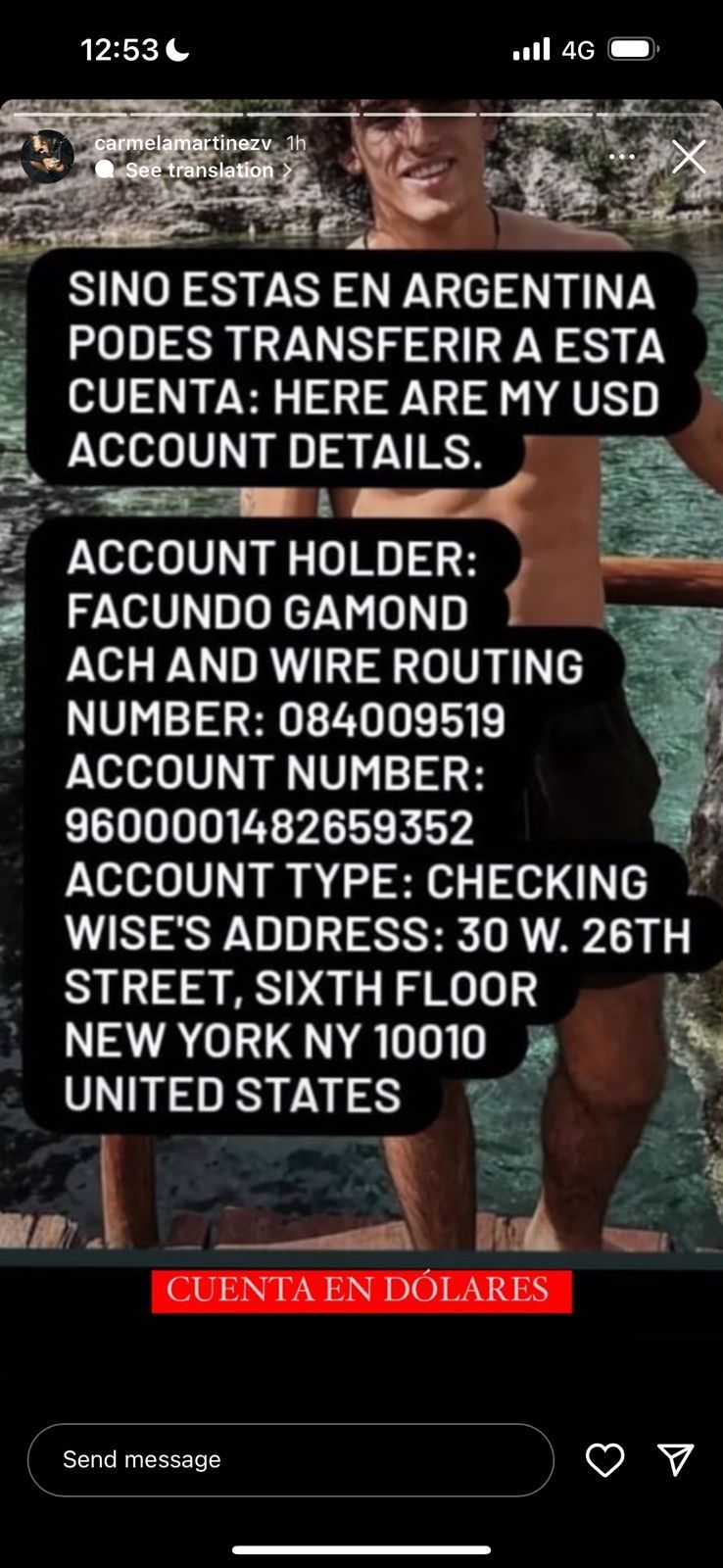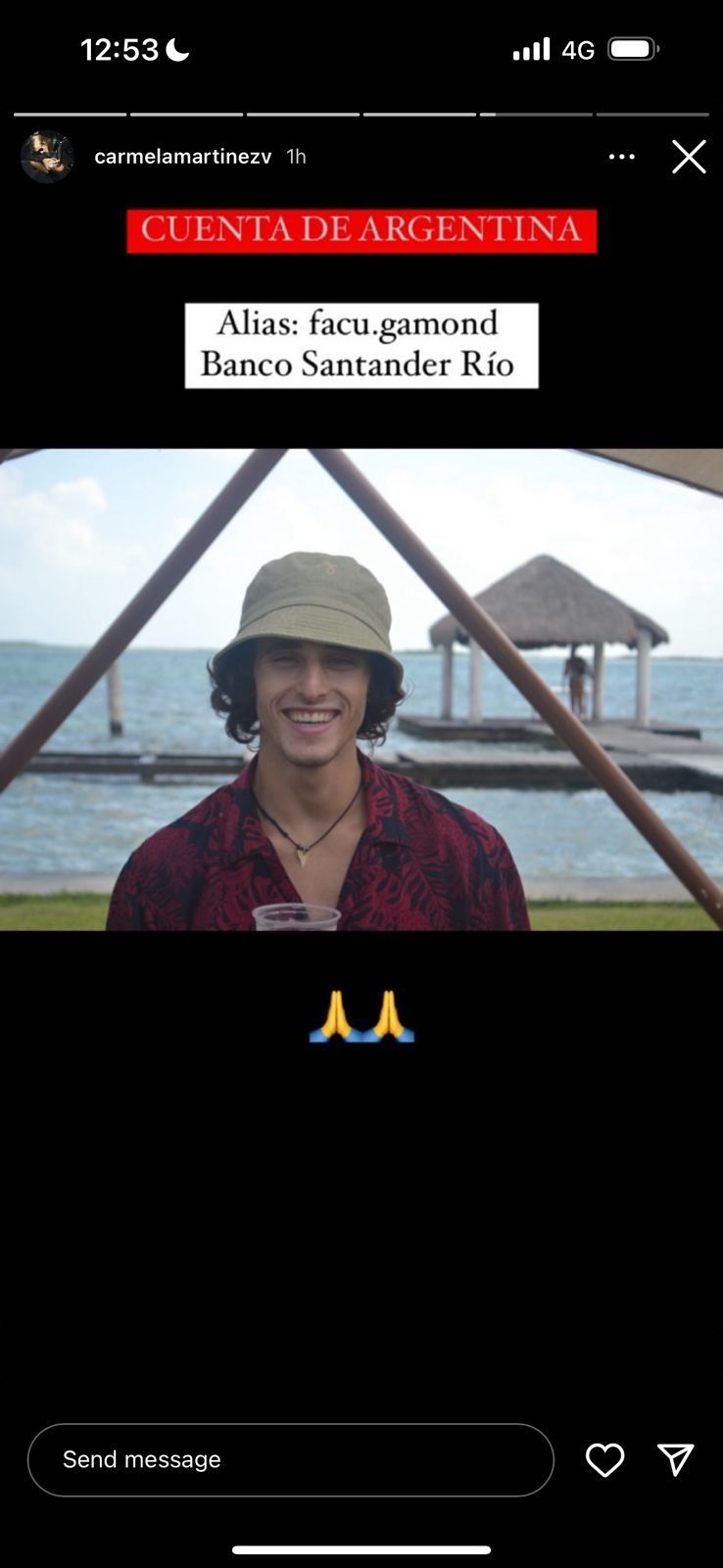 Quien sufrió las lesiones de mayor gravedad fue el cordobés Benjamín Gamond (23), pareja de Carmela, que se encuentra internado en delicado estado. Ante esto, su novia grabó un video que luego difundió en las redes sociales, detallando cómo está su salud y pidiendo ayuda para afrontar todos los gastos de hospitalización.