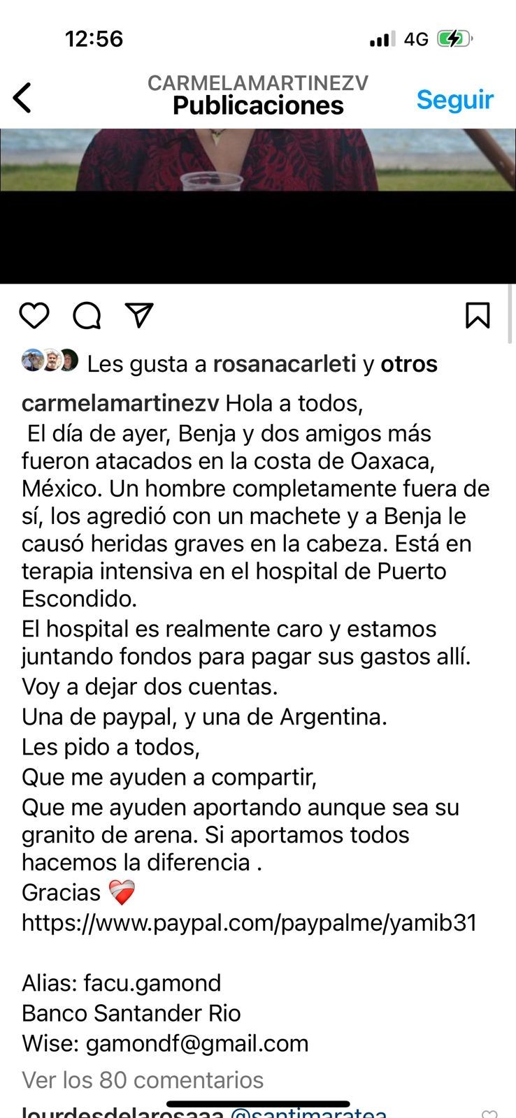 "El estado de Benja es muy crítico. Está ahora en el hospital de Puerto Escondido, y si bien lo iban a trasladar a la Ciudad de México donde está el quirófano listo, nos dieron de baja el helicóptero. Sus minutos están contados y pudimos conseguir otro helicóptero, pero no lo van a mover si no tenemos la plata. Por eso les pido que empiecen a depositar", explicó Carmela, agregando posteriormente las cuentas bancarias para colaborar.