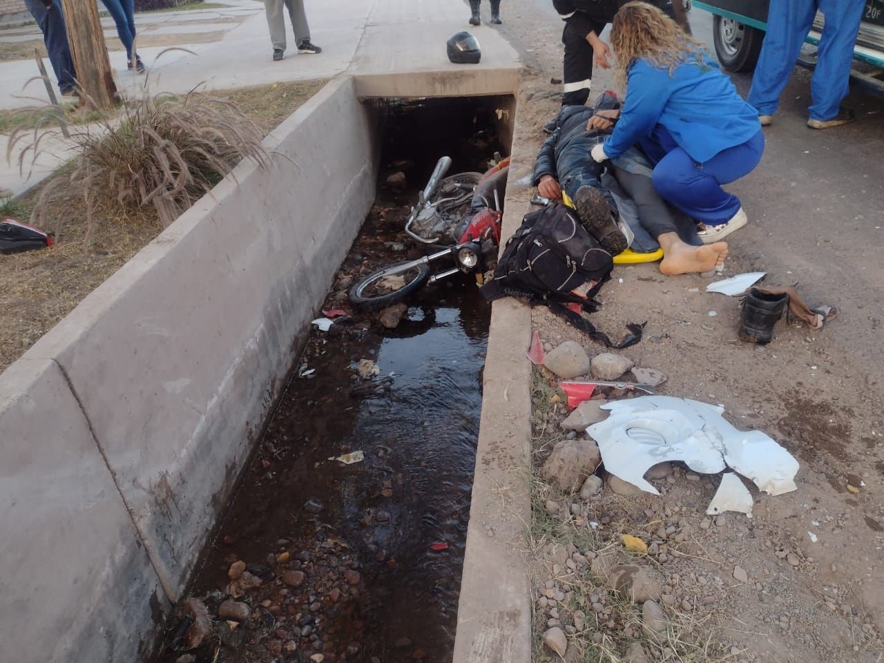 El impacto fue tan brusco que el motociclista terminó adentro de la acequia tras ser atropellado.
