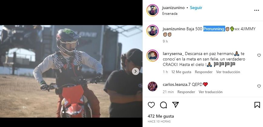 El piloto de motos mendocino Juan Zunino falleció este lunes mientras se preparaba para participar de la competencia Baja 500, a disputarse en Ensenada, Baja California, México. Tenía 27 años.
