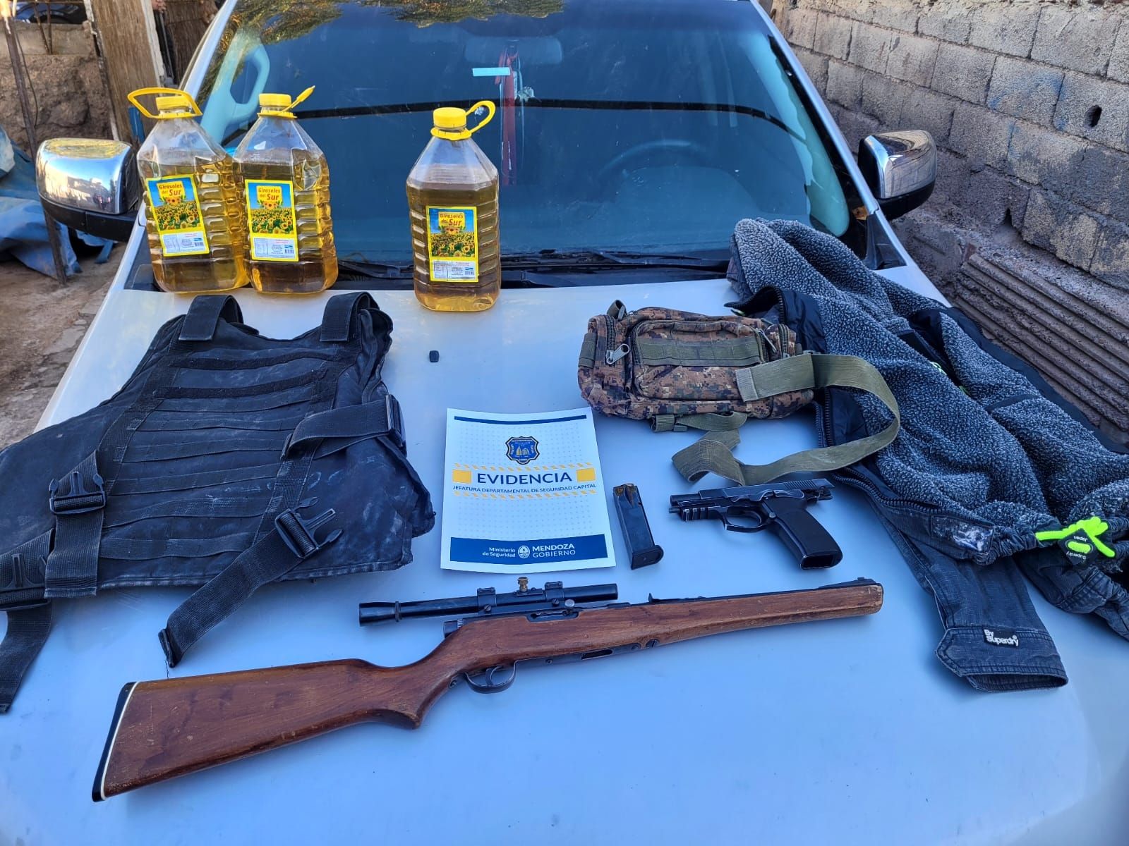 Además de recuperar la camioneta Ford Ranger gris (patente NQF 954), los efectivos también confiscaron un arma 9mm en un bolso tipo moral y bidones de aceites varios. Al requisar la propiedad en el interior de un tanque la policía encontró un chaleco antibalas con porta placa, una carabina calibre 22 con mira telescópica, otro morral el cual contenía en su interior un revolver, una pistola aparentemente limada y una caja con municiones.