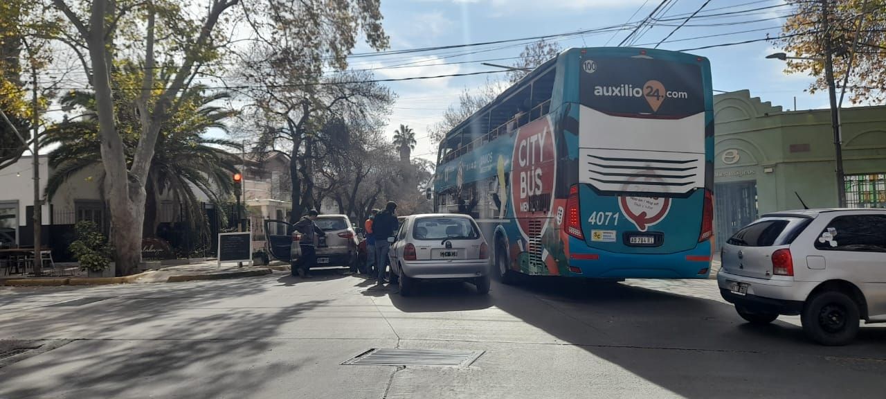 El micro de Mendoza City Bus, que hace un recorrido con turistas por el Parque General San Martín y algunos puntos de la Ciudad, quiso esquivar los rodados y terminó impactando contra algunos autos estacionados.