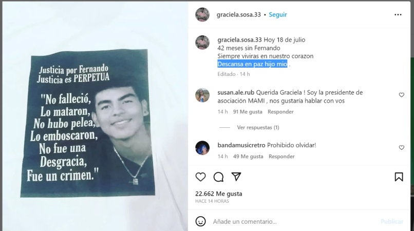 Esta publicación la realizó a días de que los homicidas de su hijo salgan por primera vez de la cárcel de Melchor Romero para una audiencia de apelación de las penas, recurso utilizado por todas las partes intervinientes en el caso, El mensaje finalizó con un "descansa en paz hijo mío".
