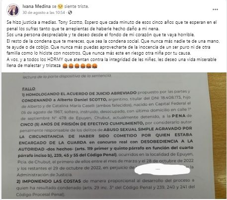 Scotto fue hallado culpable del delito de "abuso sexual simple agravado" en perjuicio de una joven de 19 años con retraso madurativo, informó el diario El Chubut. En el momento en que ocurrió el abuso, el sujeto vivía en la casa de la víctima ya que mantenía una relación sentimental con su madre.