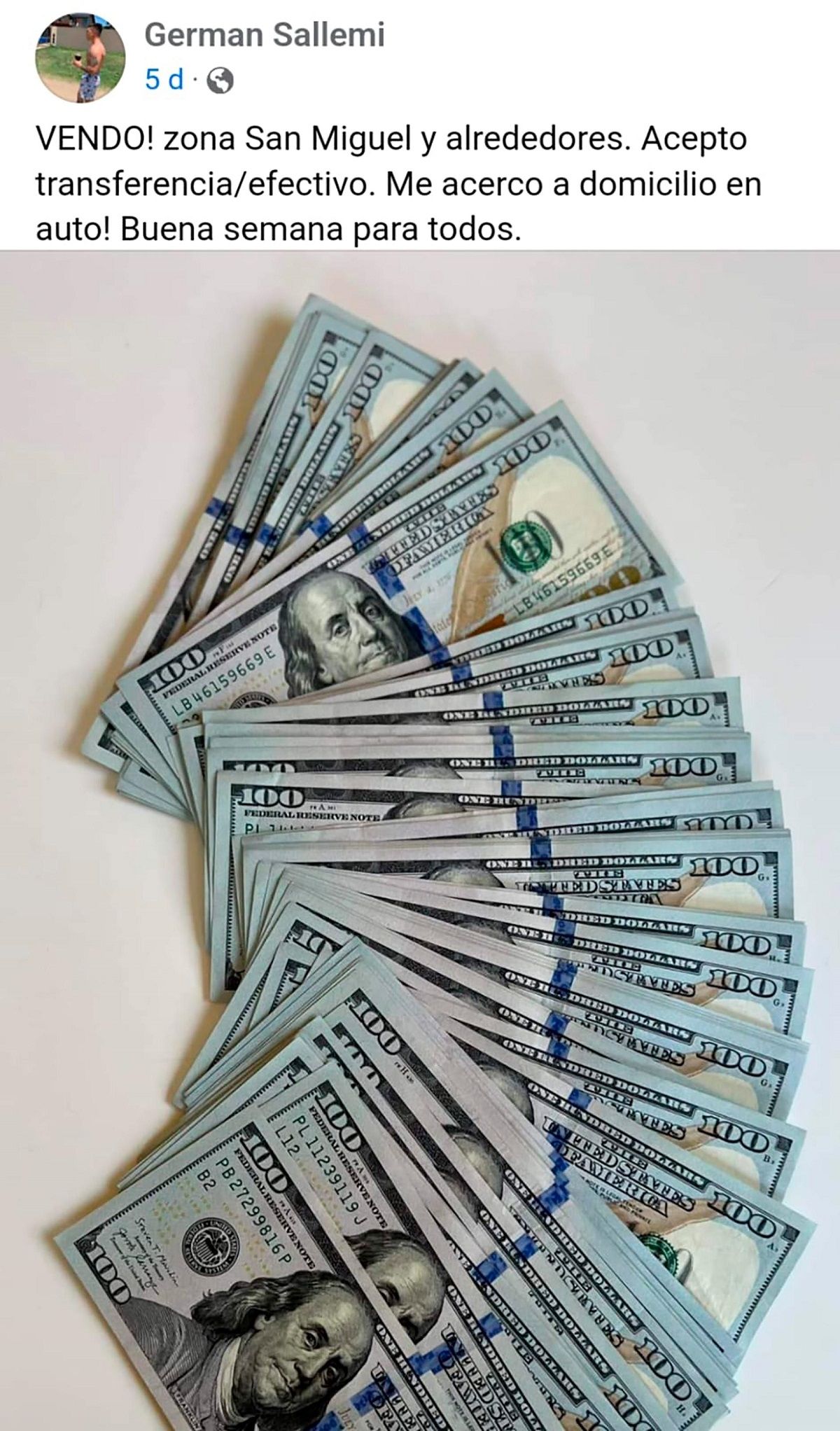 El 12 de enero, en una publicación similar acompañada de una fotografía con varios billetes de dólares sobre una mesa, posteó: “Vendo zona San Miguel y alrededores. Consultas por privado me acerco en auto”.