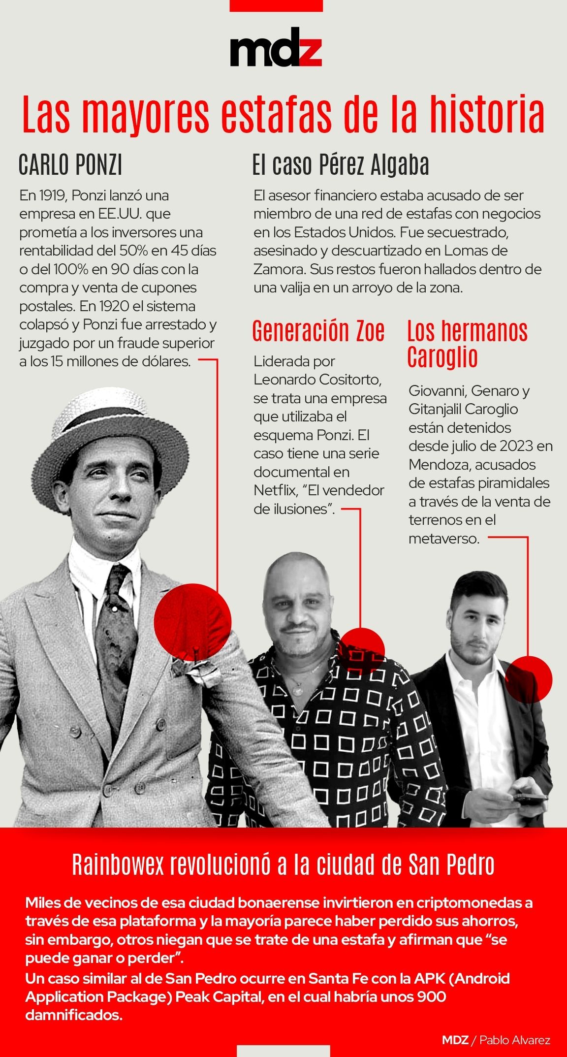Mientras avanza la investigación por el caso RainbowEx, que mantiene en vilo a la ciudad de San Pedro, otras posibles estafas piramidales se replican en distintas ciudades, al tiempo que importantes causas como la de Generación Zoe o la de los hermanos Caroglio en Mendoza, se encuentran en distintas etapas. Repasamos los casos emblemáticos, las diferencias con el esquema Ponzi y qué hacer para no caer en la trampa del dinero fácil.