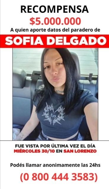 El Ministerio Público de Acusación de Santa Fe informó que ofrece una millonaria recompensa para quien aporte datos sobre el paradero de Sofía Delgado, una joven de 20 años que fue vista por última vez la noche del 30 de octubre, cuando salió de su casa.