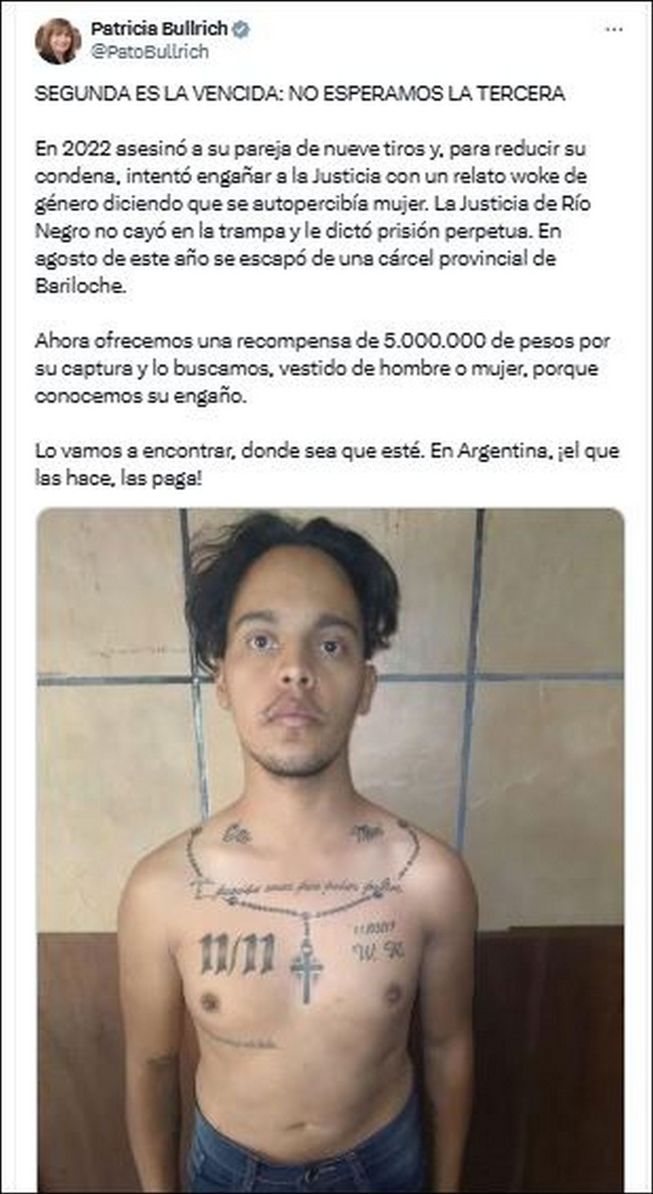 Y continúa: "En agosto de este año se escapó de una cárcel provincial de Bariloche. Ahora ofrecemos una recompensa de 5.000.000 de pesos por su captura y lo buscamos, vestido de hombre o mujer, porque conocemos su engaño. Lo vamos a encontrar, donde sea que esté. En Argentina, ¡el que las hace, las paga!", cerró la funcionaria.