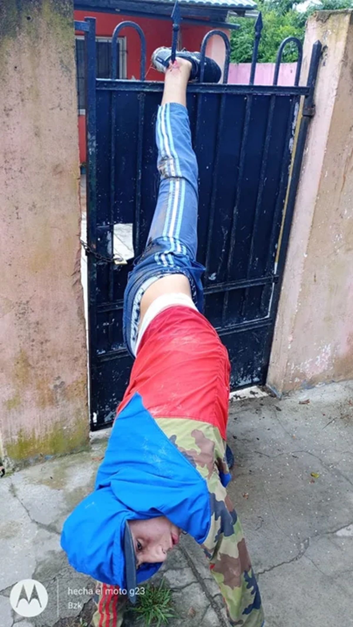 Aparentemente, el ladrón había intentado trepar la puerta de metal, se resbaló y la estructura de metal le atravesó el tobillo. Por lo tanto, perdió el equilibrio y quedó tendido cabeza abajo. Debido a los gritos de dolor del delincuente, los vecinos advirtieron lo que había ocurrido e inmediatamente, llamaron al 911. Mientras esperaban la llegada de los efectivos, los vecinos empezaron a grabar y a sacarle fotos al malviviente.