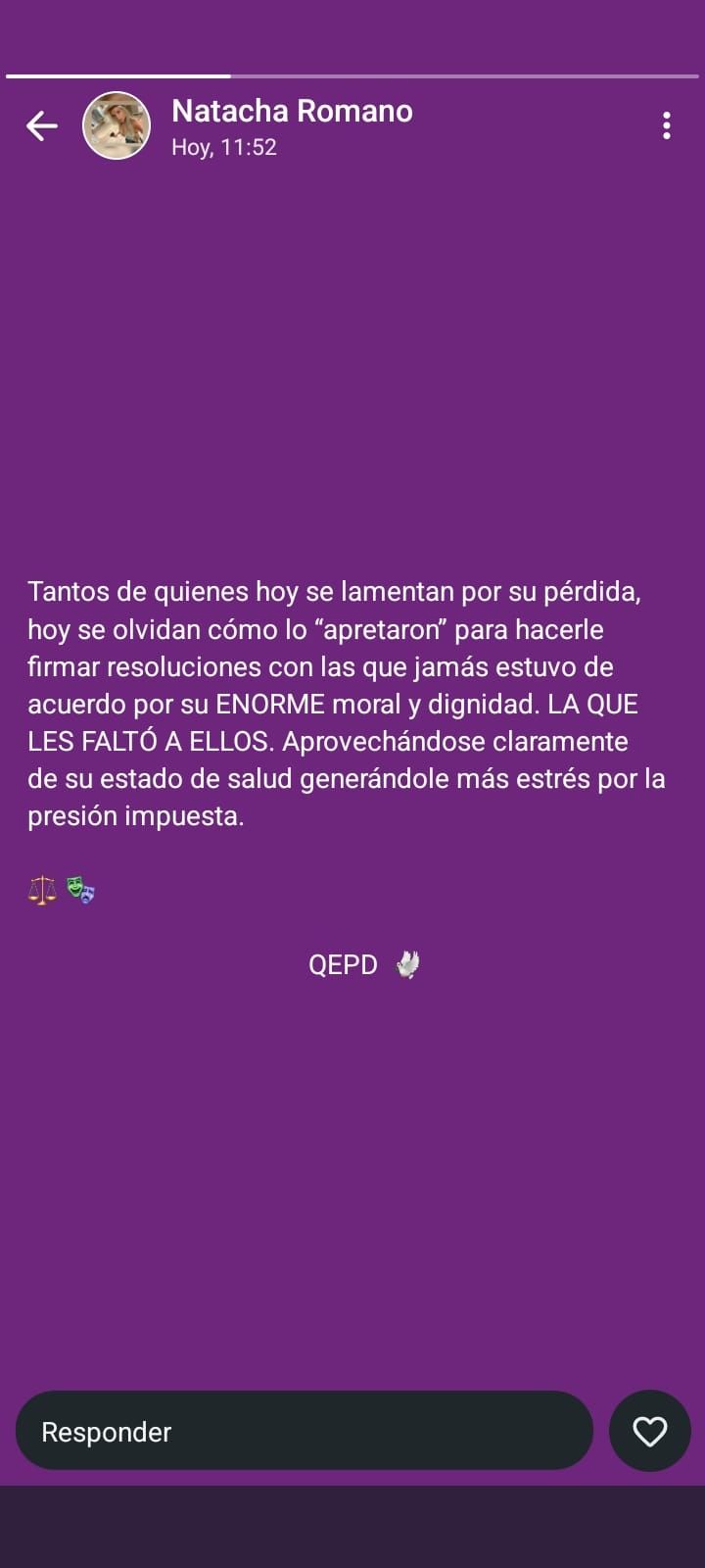 "Tanto de quienes hoy se lamentan por su pérdida, hoy se olvidan de cómo lo 'apretaron' para hacerle firmar resoluciones con las que jamás estuvo de acuerdo por su ENORME moral y dignidad. LA QUE LES FALTÓ A ELLOS. Aprovechándose claramente de su estado de salud, generándole más estrés por la presión impuesta", publicó la letrada en un estado de WhatsApp, acompañado finalmente por la leyenda QEPD (que en paz descanse):