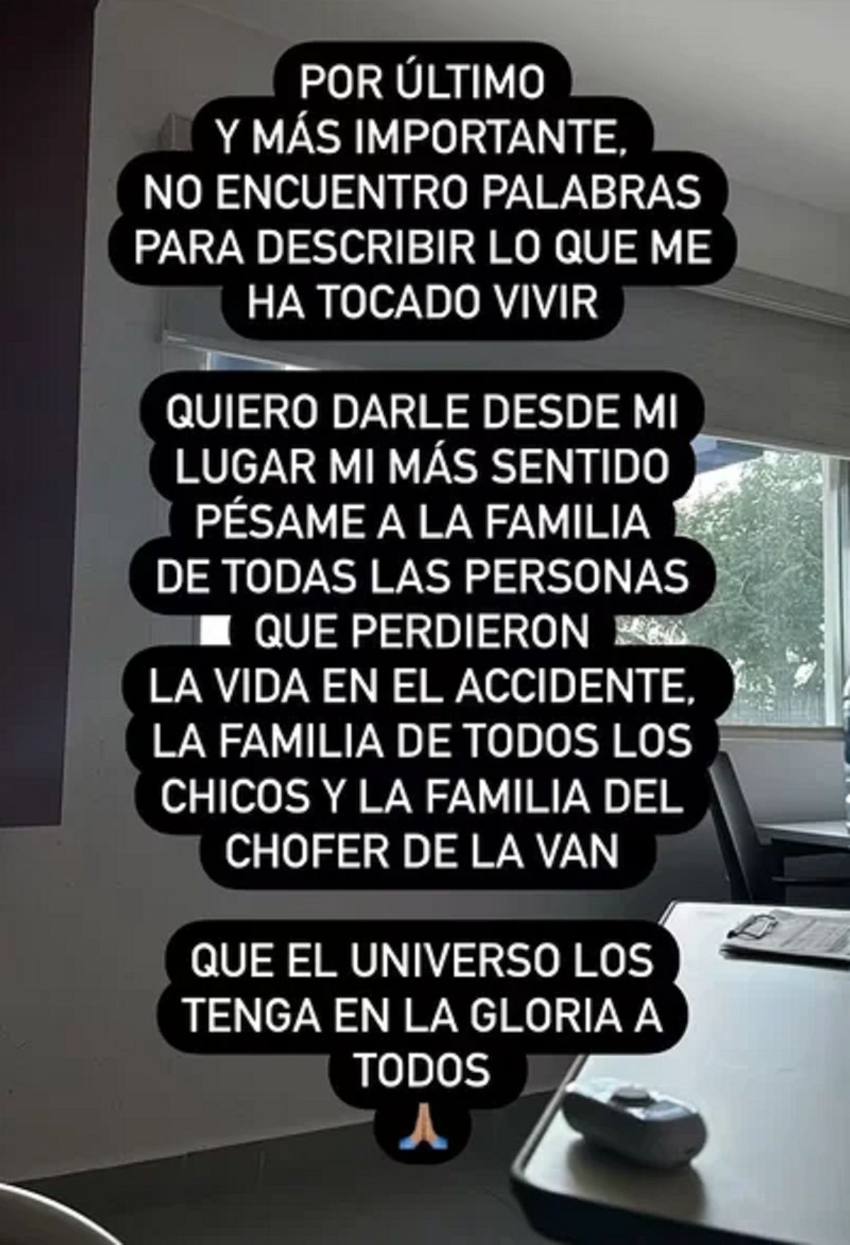 "Quiero darles desde mi lugar mi más sentido pésame a la familia de todas las personas que perdieron la vida en el accidente. La familia de todos los chicos y del chofer de la VAN. Que el universo los tenga en la gloria a todos", finalizó.