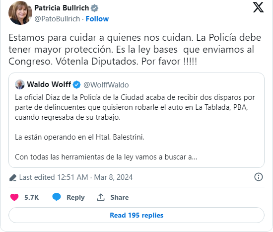A su vez, la ministra de Seguridad, Patricia Bullrich, le pidió a los diputados que aprueben la Ley Bases para proteger a las fuerzas de seguridad.