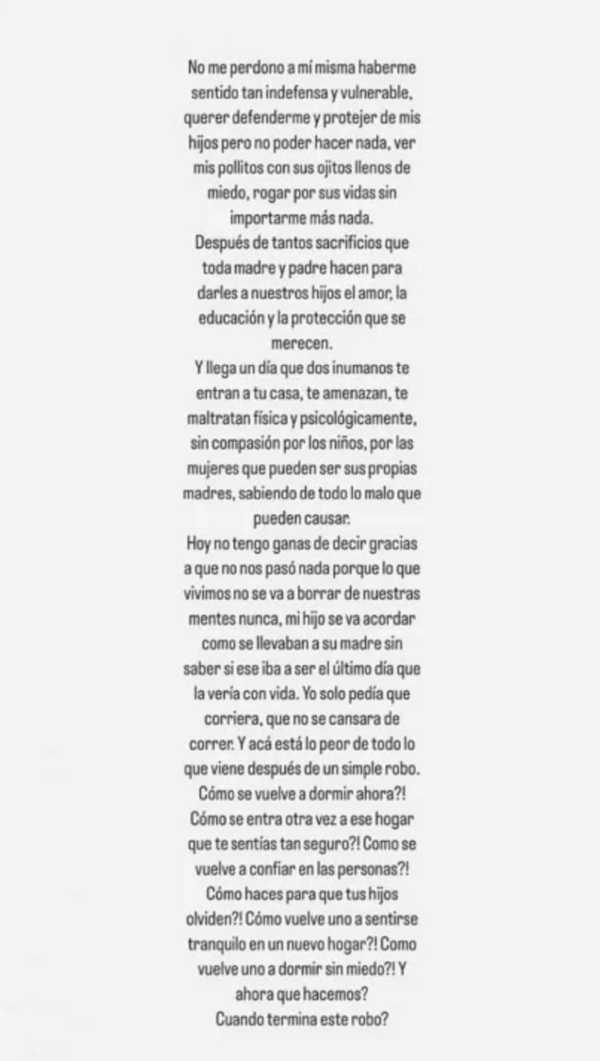 “Mi hijo se va a acordar cómo se llevaban a su madre sin saber si ese iba a ser el último día que la vería con vida. Yo solo pedía que corriera, que no se cansara de correr” comentó la pareja de Moreno que agregó que los delincuentes le robaron todo el dinero que tenía en la casa y huyeron.