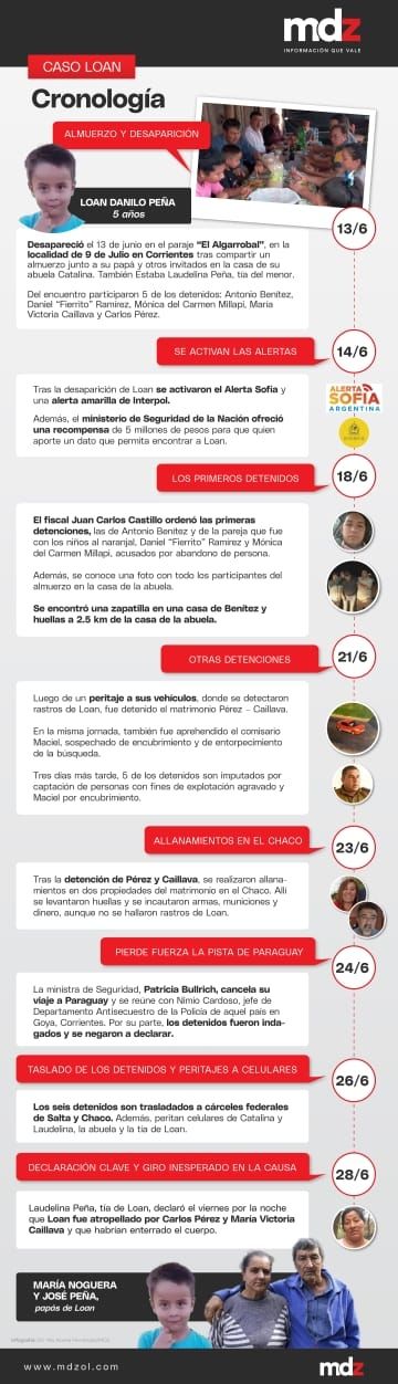 El caso Loan acapara la atención de todo el país desde hace 17 días y plantea nuevos interrogantes tras el giro inesperado luego de la declaración de Laudelina Peña, la tía del menor que manifestó que el pequeño fue atropellado y su cuerpo enterrado por Carlos Pérez y María Victoria Caillava después del almuerzo y la caminata hacia el naranjal en la ciudad e 9 de Julio, en Corrientes. En MDZ repasamos la cronología de un episodio confuso y cambiante que parece acercarse hacia el peor final.
