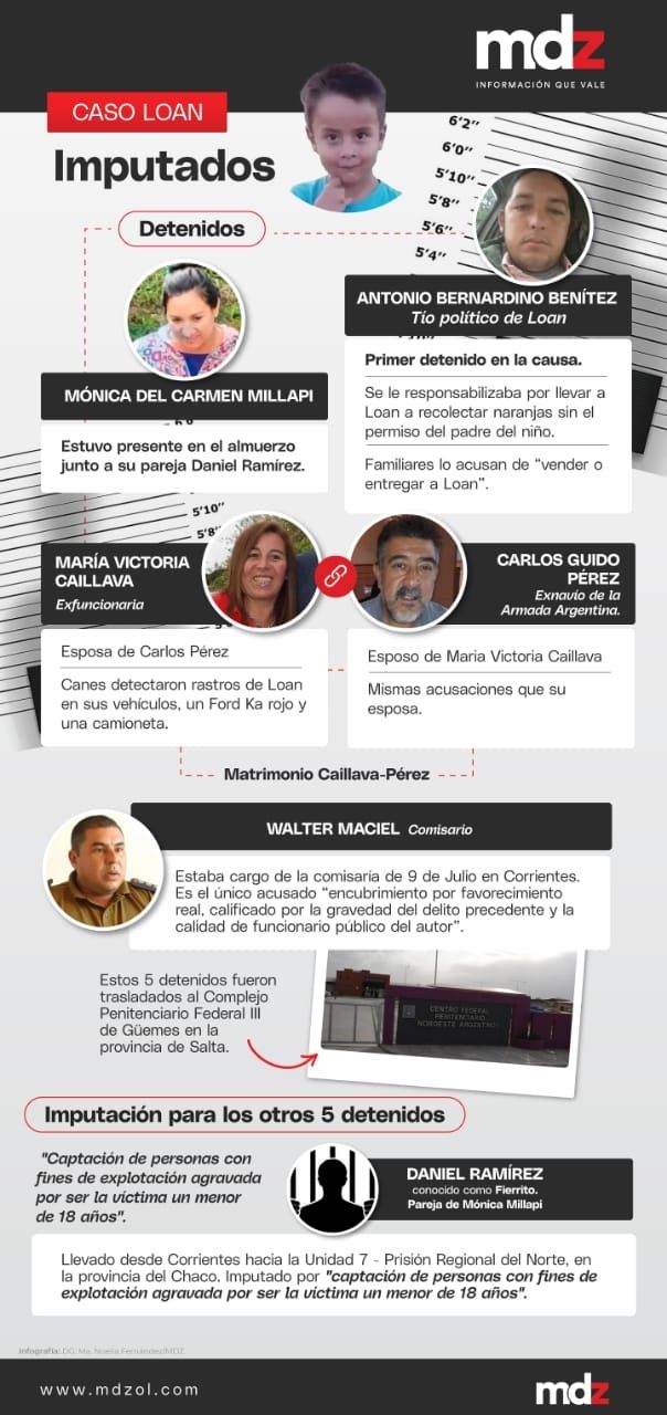 Tres días después, se concretaron otras tres detenciones y el caso dio un giro hacia una hipótesis mucho más oscura, la trata. En este contexto, cayeron Pérez y Caillava, luego de que los perros de la Policía detectaran rastros de Loan en dos vehículos del matrimonio. Por su parte, el comisario Maciel fue detenido acusado por encubrimiento. Después, salvo Maciel, cambió la carátula para los otros 5 aprehendidos: captación de personas con fines de explotación agravado.