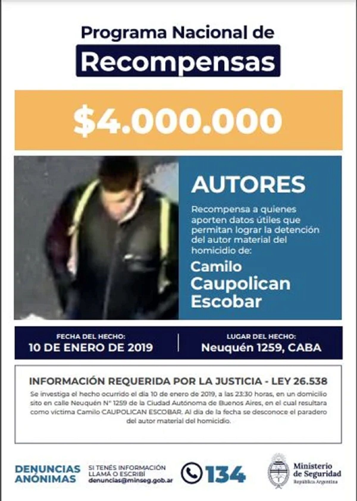 La Justicia difundió videos de diversas cámaras de seguridad para lograr identificar al autor de un homicidio que tuvo lugar en enero de 2019 en el barrio porteño de Caballito, por el que hay una recompensa de 4 millones de pesos.
