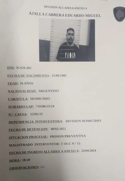 Entre los fugados está Eduardo Miguel Ajalla Cabrera, alias "Calabaza", un barrabrava del club Atlanta acusado del asesinato del financista Carlos Walter Molina en noviembre de 2021. El individuo estuvo prófugo durante dos años hasta que lo capturaron en diciembre de 2023 cuando intentaba cruzar a Brasil. En aquel momento, el Ministerio de Seguridad ofrecía 3 millones de pesos de recompensa por su captura.
